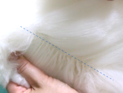 | 【ブラッシング時の被毛の状態(根元)】 ===== 青点線〈上部〉は根元からときほぐれた状態です。( ふわふわ になっています) 青点線〈下部〉はまだ根元が束のまま残っている状態です。( 毛糸状 のままです) |